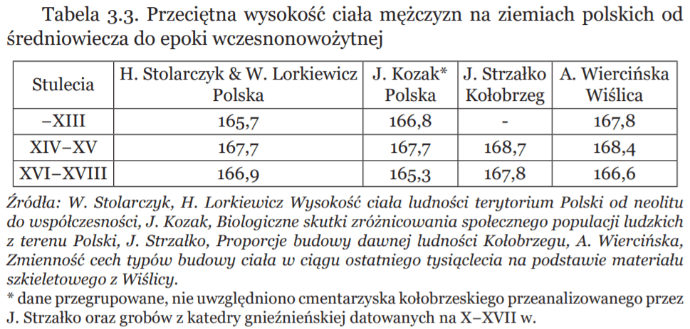 Źródło: tabela z książki Michała Kopczyńskiego „Historia gospodarcza ciała. Studia z dziejów biologicznego standardu życia na ziemiach polskich”, s. 70 („Rozdział III. Wysokość ciała jako miernik standardu życia na ziemiach polskich od średniowiecza do początku XIX wieku”).