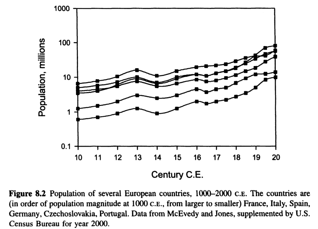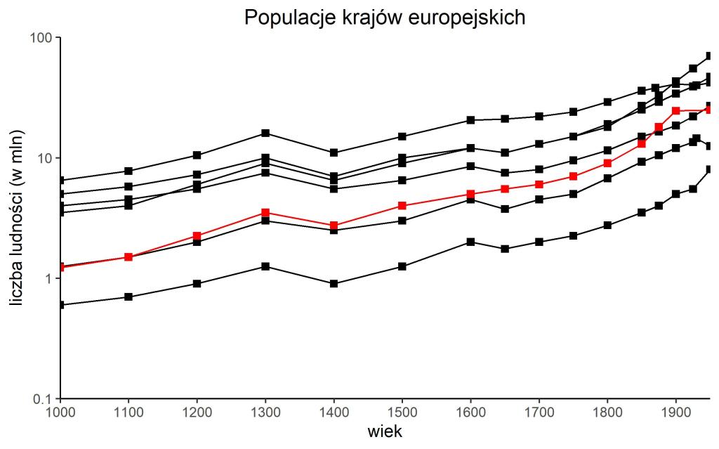 O ile spadek populacji w XIV w. widoczny jest również w przypadku Polski (chociaż XV-wieczne „odbicie” po nim jest silniejsze niż w przypadku pozostałych krajów), o tyle kryzys XVII-wieczny – już nie (co zaskakujące, biorąc pod uwagę skutki demograficzne wojen tego czasu – zwłaszcza potopu szwedzkiego). Podobną obserwację wynotował Turchin dla Francji, tłumacząc to wspomnianym już niedoszacowywaniem fluktuacji przez McEvedy’ego i Jonesa oraz uśrednieniem dynamiki północy i południa Francji (na potrzeby ustalenia ludności z obszaru współczesnego państwa). W przypadku Polski wzrost populacji jest jednak w tym okresie silniejszy niż we Francji. Kolejną różnicą między polskim szeregiem czasowym a pozostałymi jest znaczniejszy przyrost liczby ludności w XIX w. Tutaj znowu trzeba podkreślić, że dane dotyczą dzisiejszych terytoriów Rzeczpospolitej Polskiej – a zatem np. obszaru Śląska czy Prus Wschodnich, co również może zaburzać obraz dynamiki ludności Polski historycznej.