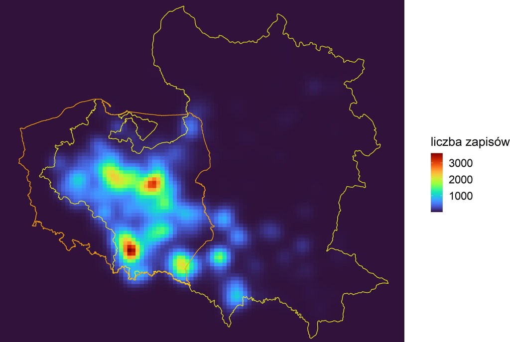 Idąc za wzorem takich oto ładnych mapek dla Finlandii (w dużej części będących częścią tej publikacji), postanowiłem dodatkowo zwizualizować geograficzną „koncentrację” zapisów: