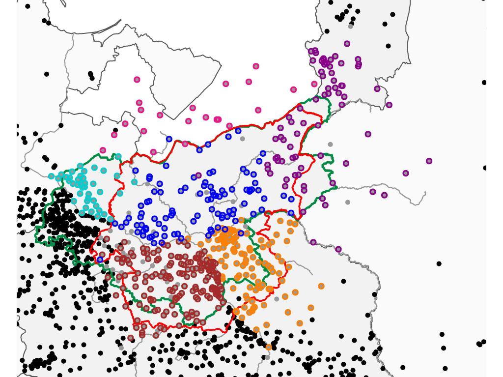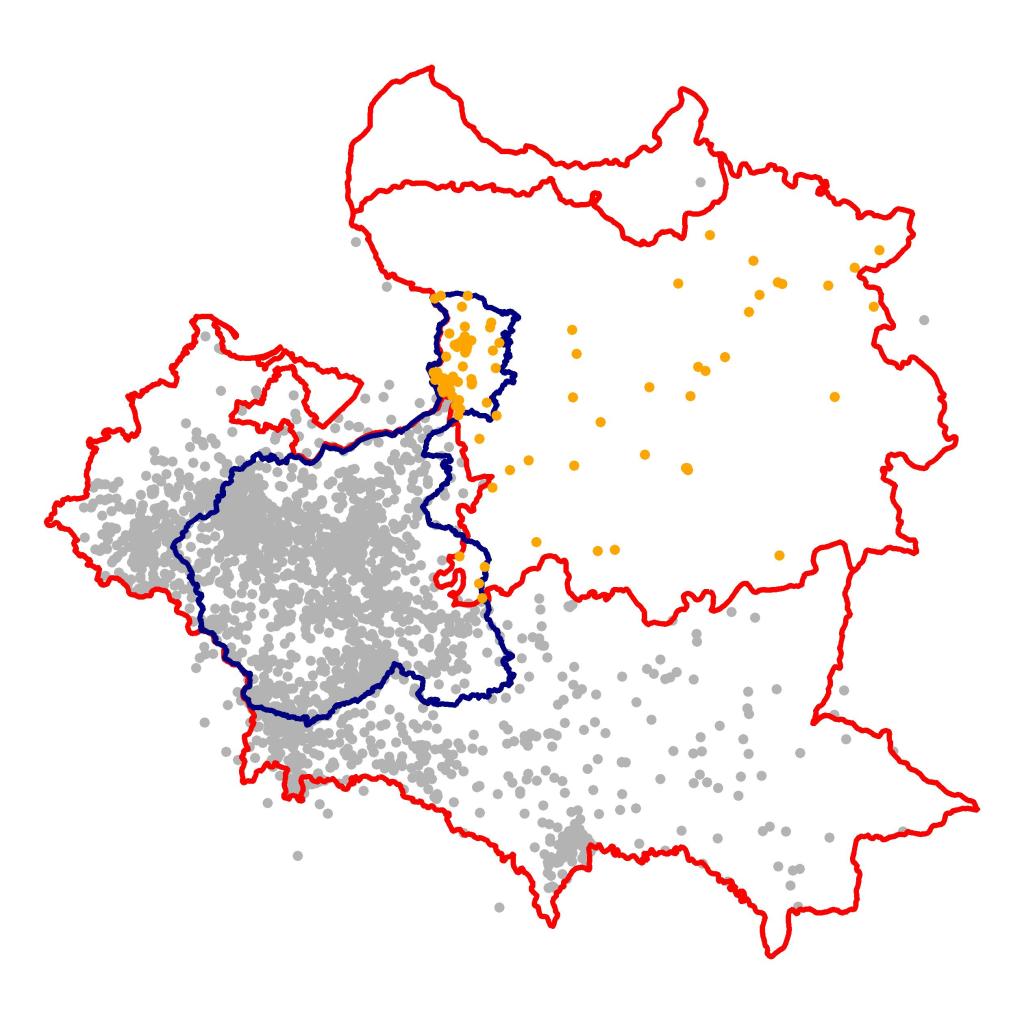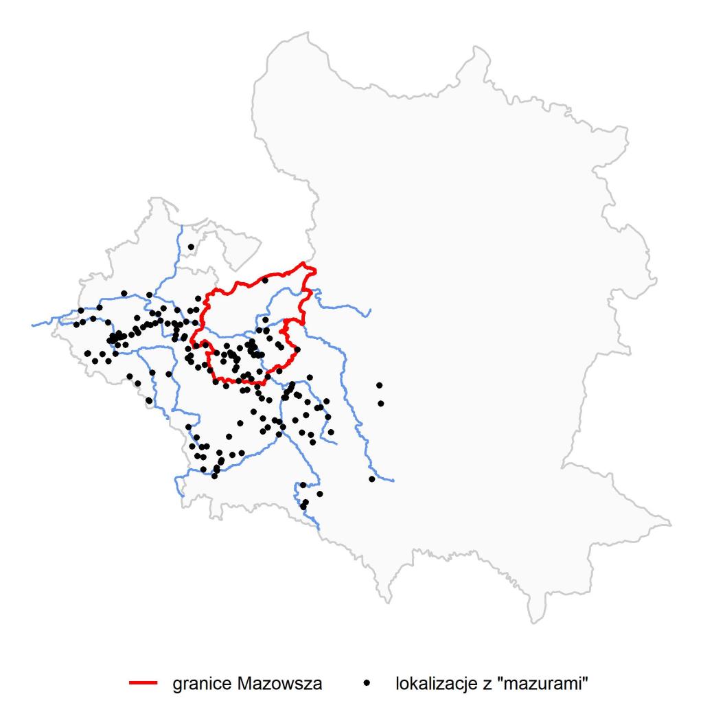 Idąc za tropem, że granice regionu wyznaczają granice regionów sąsiednich, spróbowałem do powyższej mapy dodać punkty, które nie występują w notach lokalizacyjnych tomów Mazowsza. A oto efekt: