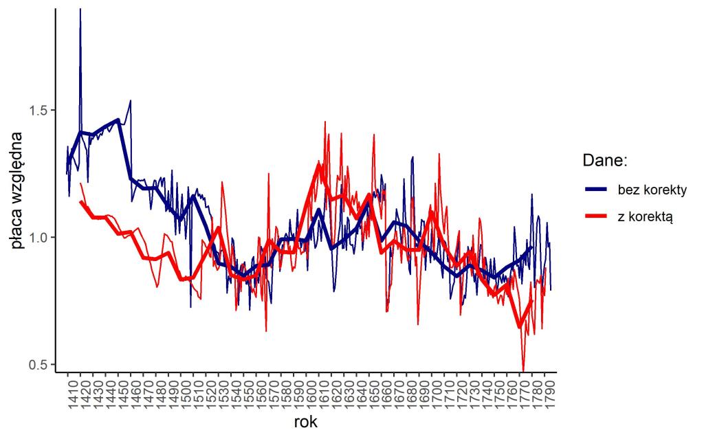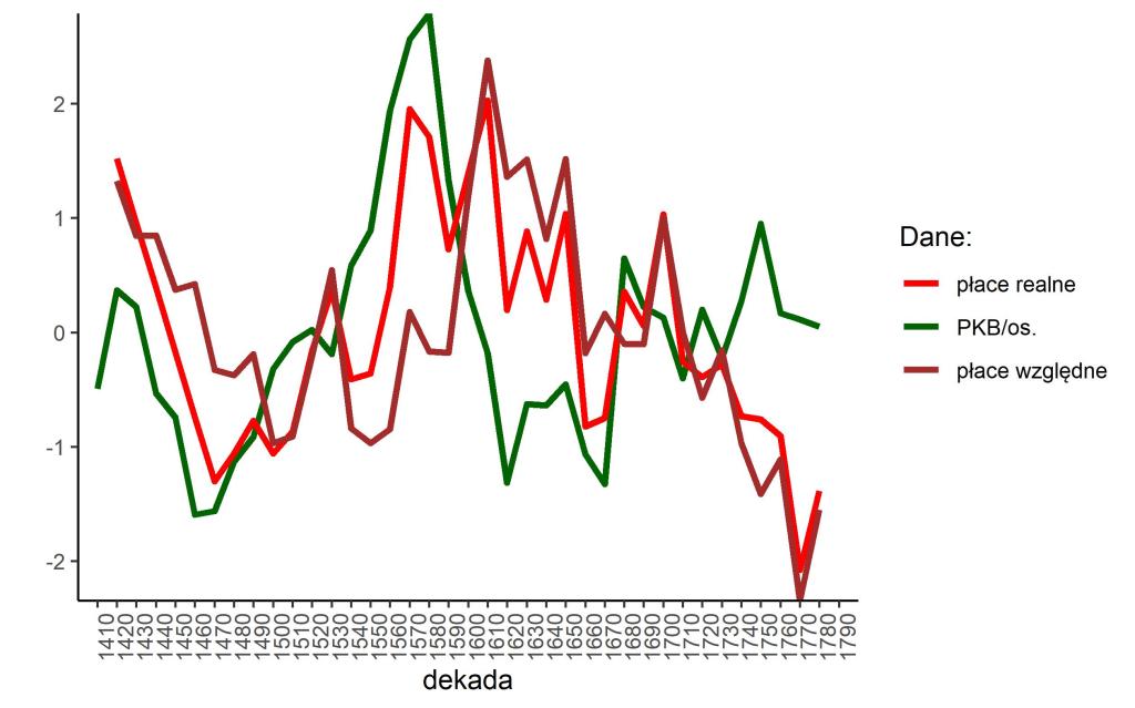 Jedną z ważniejszych zmiennych w teorii strukturalno-demograficznej (TSD) są realne płace, będące jedną z aproksymant „zadowolenia społeczeństwa” (w późniejszych odsłonach TSD zastąpione w tej roli przez płace względne – tj. płace realne podzielone przez PKB per capita). Historyczne wartości tej zmiennej dla Polski (obejmujące całą nowożytność) doczekały się różnych oszacowań, które przedstawiane są nawet w „rozdzielczości” rocznej (np. dane Roberta Allena dla polskich miast). Wskaźnik ten ma zatem ważkie znaczenie teoretyczne i jest empirycznie uchwytny – stąd też poświęcę mu trochę więcej uwagi.