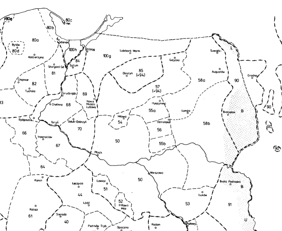 Podział ten z góry zakłada wyjście poza obszar historycznego Mazowsza, a co więcej, opiera się nie tyle na tradycyjnych lub administracyjnych podziałach (ani etnograficznych), ale na kryteriach „hydrograficznych” (granice na Wiśle i Bugu). Przypisane zapisy nutowe do poszczególnych regionów prezentują się na mapie następująco: