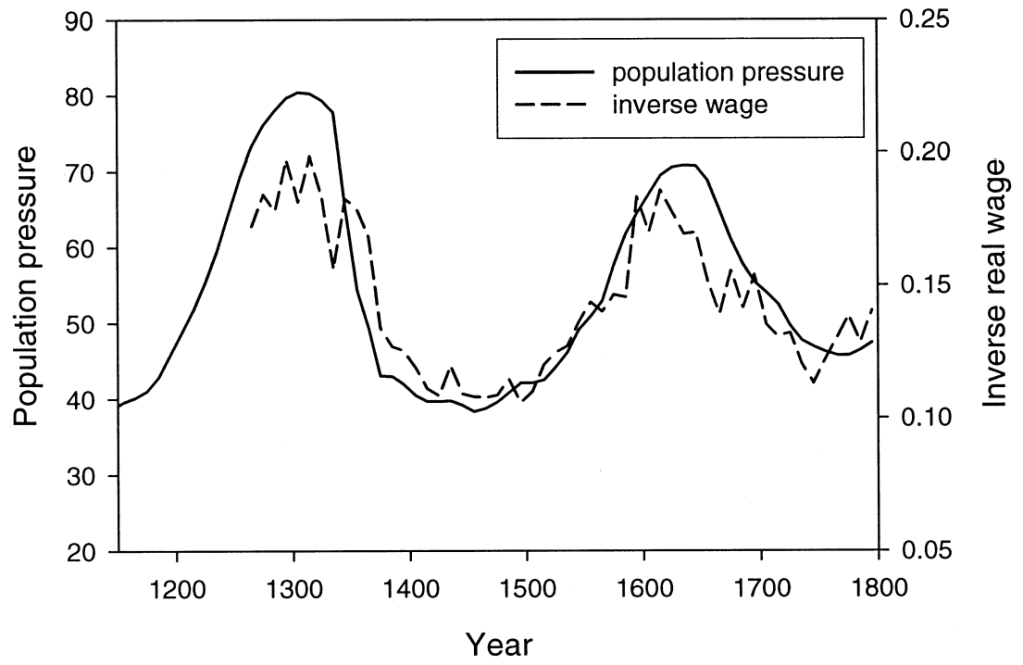 Źródło: Peter Turchin i Sergey A. Nefedov (2009): „Secular Cycles”, s. 108. Wskaźnik niedoli (odwrotność płac realnych) zaznaczono przerywaną linią.
