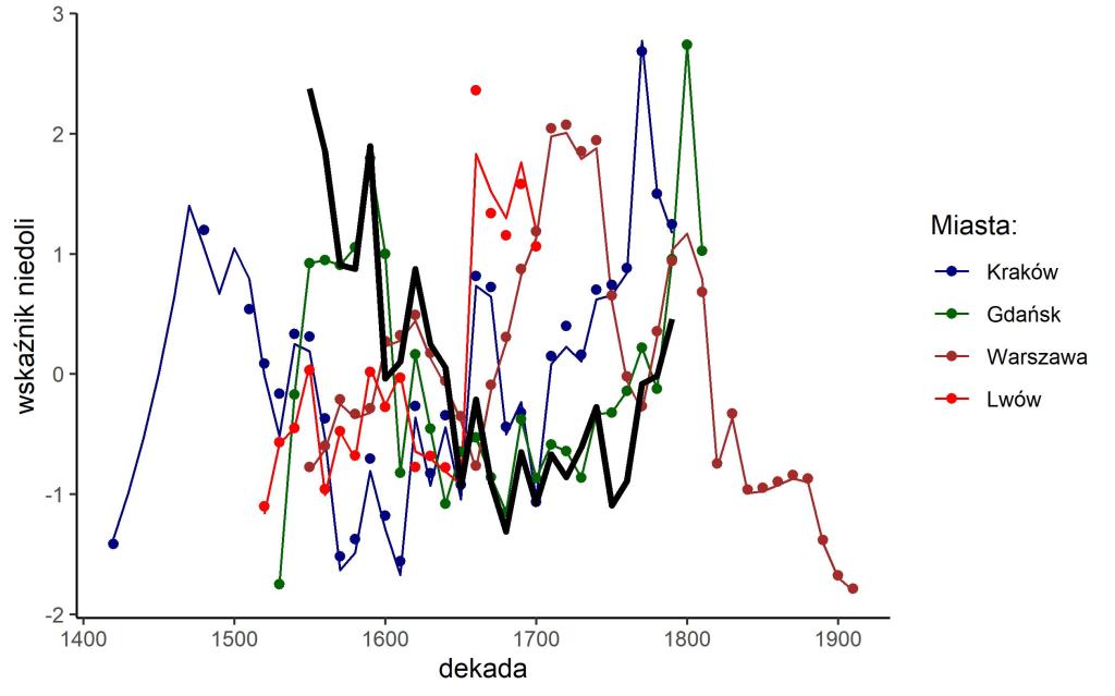 Wykres nie należy do najczytelniejszych, niemniej pozwala wysunąć parę istotnych obserwacji. Przede wszystkim, gdyby opierać wyznaczanie cykli sekularnych na podstawie wskaźników niedoli dla miast, to należałoby stwierdzić, że proces sekularny odbywał się w każdym mieście w trochę innym czasie. Najbliżej „referencyjnego” wskaźnika wyliczonego na bazie danych Malinowskiego jest Gdańsk (nie będący jednak najbardziej reprezentatywnym miastem Rzeczpospolitej). Dla pomorskiego portu jeden cykl zaczynałby się po 1500 r., kończył ok. 1700, po czym zaczynałby się drugi cykl z punktem kulminacyjną ok. 1800 r. Odmiennych faz cyklu sekularnego doświadczałyby Warszawa i Lwów (trend integracyjny w trakcie gdańskiego okresu międzycyklicznego). Jeszcze inaczej przechodziłby to Kraków: pierwszy cykl zaczynałaby się jeszcze w I połowie XV w. (z trendem integracyjnym w czasie panowania Jagiellonów) i kończył w XVII w., przechodząc w kolejny cykl z punktem kulminacyjnym w II poł. XVIII w. (samo przejście można interpretować albo jako wstrząsy fazy depresji poprzedniego cyklu, albo jako początki fazy ekspansji następnego). Pomimo tych różnic, połowa XVII w. w przypadku każdego z miast wydaje się przynależeć do okresu międzycyklicznego.