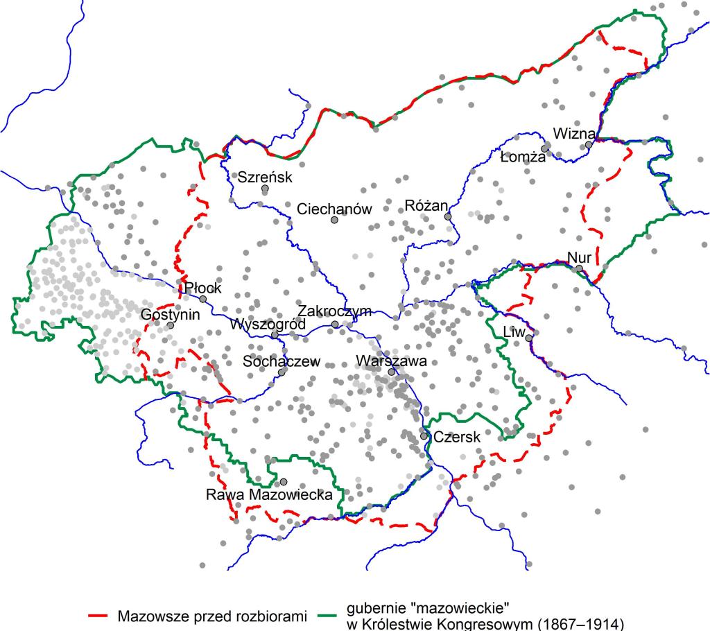 Czarne kropki – miejscowości nie występujące w notach lokalizacyjnych tomów Mazowsza, Mazur Pruskich i I tomu (Pieśni…). Szare kropki – miejscowości w notach lokalizacyjnych tomów Mazowsza i Mazur Pruskich. Kolorowe obwódki odpowiadają kolorom z poprzedniej mapy prezentującej kolbergowski podział Mazowsza na Polne, Leśne i Stare. Ponadto zaznaczono granice i obszar Rzeczpospolitej (jaśniejszy szary) i Królestwa Kongresowego (ciemniejszy szary), granic historycznych Mazowsza (na czerwono), guberni „mazowieckich” (na zielono) oraz rzeki (na szaro).