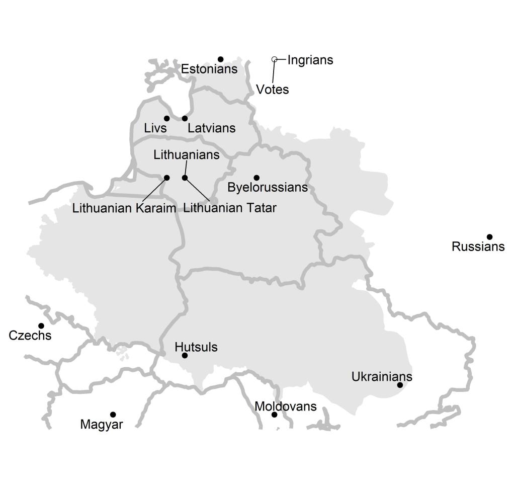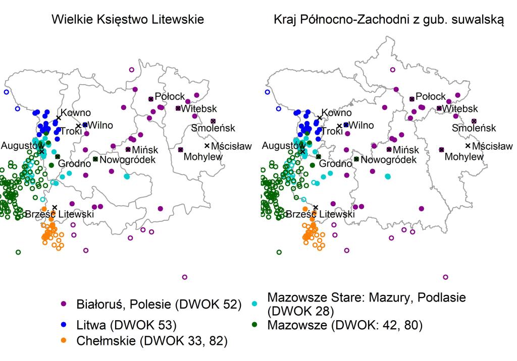 Miejscowości, którym przypisano zapisy nutowe w DWOK. Im ciemniejsza kropka – tym więcej przypisanych melodii. Zaznaczono granice: Rzeczpospolitej z 1772 r., granice współczesnej Polski, a także granice między zaborami (i Królestwa Polskiego).