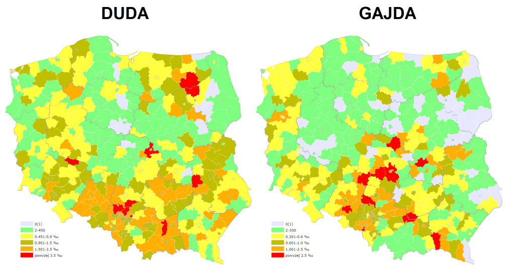 Względny udział nazwisk „Duda”, „Gajda”, „Koza”, „Kozioł” w powiatach. Źródło: stąd.