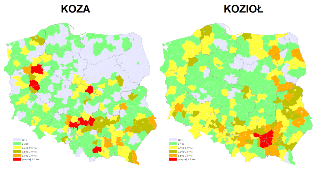 W przypadku Kozy i Kozła można obawiać się, że etymologicznie związane są one raczej ze zwierzętami niż instrumentami. Pozwolę sobie zatem tylko na uwagę, że jeden z obszarów z większym udziałem osób noszących nazwisko Koza zbliżony jest do zasięgu występowania wielkopolskiego kozła weselnego. Co ciekawe, popularność nazwiska Kozioł w tym regionie nie wyróżnia się od reszty Polski.