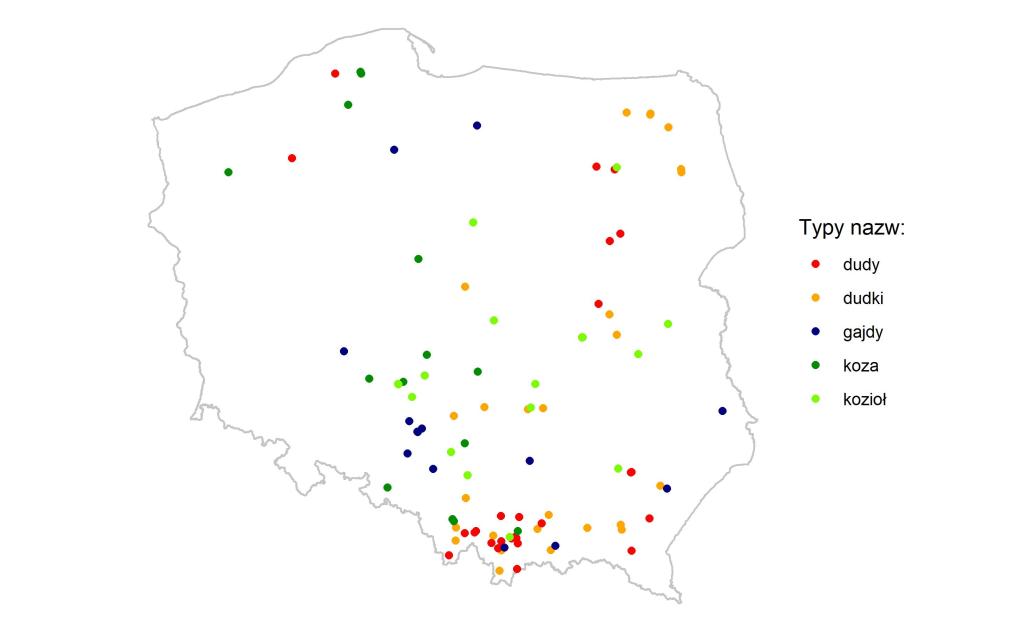Miejscowości (i części miejscowości) o nazwach „dudziarskich” przedstawiłem na mapce poniżej. Korzystałem przy tym z Polskiego Rejestru Nazw Geograficznych z 2020 r., z którego wyselekcjonowałem toponimy kojarzące się z dudami, gajdami, kozłami i kozami – bo te właśnie określenia stosowane są w przypadku polskich instrumentów dudowych.